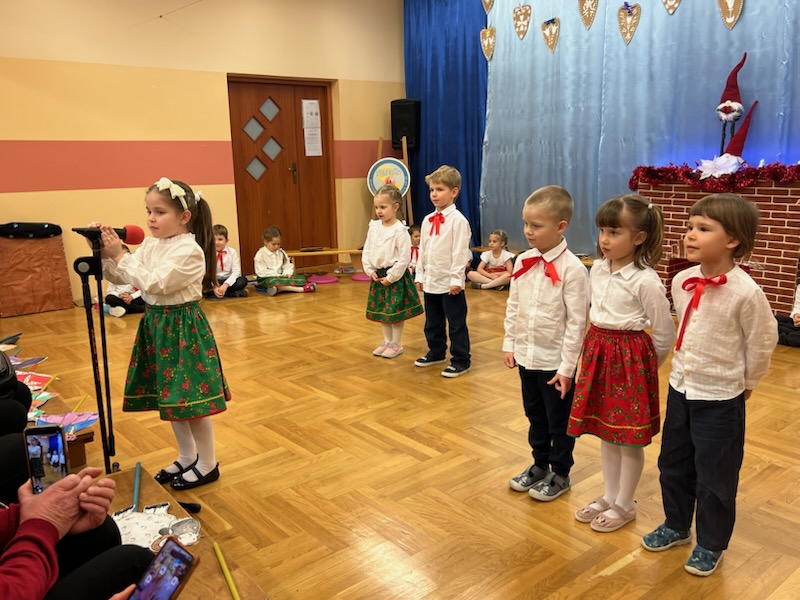 W tym roku dzieci z grupy Rozgwiazdki to już poważne 5 latki . Korzystając z wyższego poziomu różnych umiejętności przygotowaliśmy w tym roku dla naszych kochanych Babć i Dziadków program ambitny, z wieloma różnymi formami scenicznymi pt. "Kiedy Babcia z Dziadkiem byli jeszcze mali". W czasie przedstawienia były więc różne popularne i ludowe piosenki i melodie, do których dzieci tańczyły , grały i śpiewały - w grupach, solo oraz wspólnie całą grupą. Był też mini teatrzyk kukiełkowy oraz efekty świetlne - ogień w kominku, iskierki . Dla gości dzieci przygotowały upominki - laurki i breloczki do kluczyków a Rodzice przepyszne ciasta jako poczęstunek.