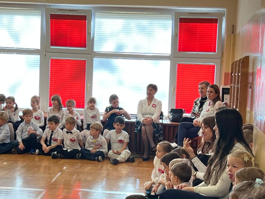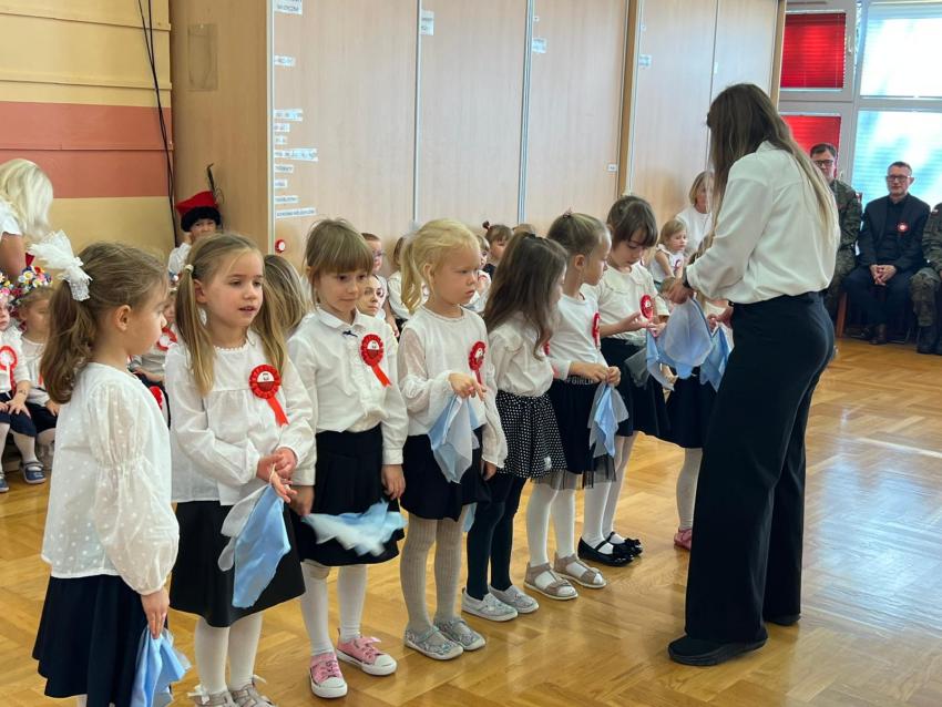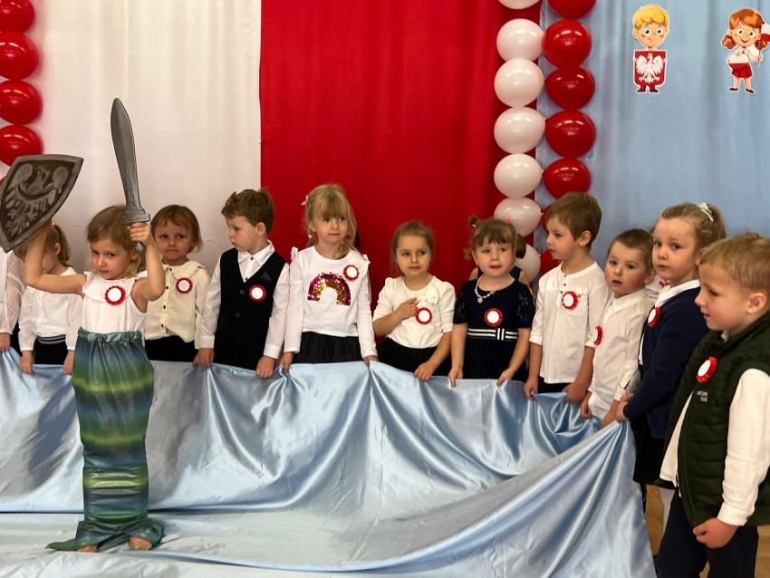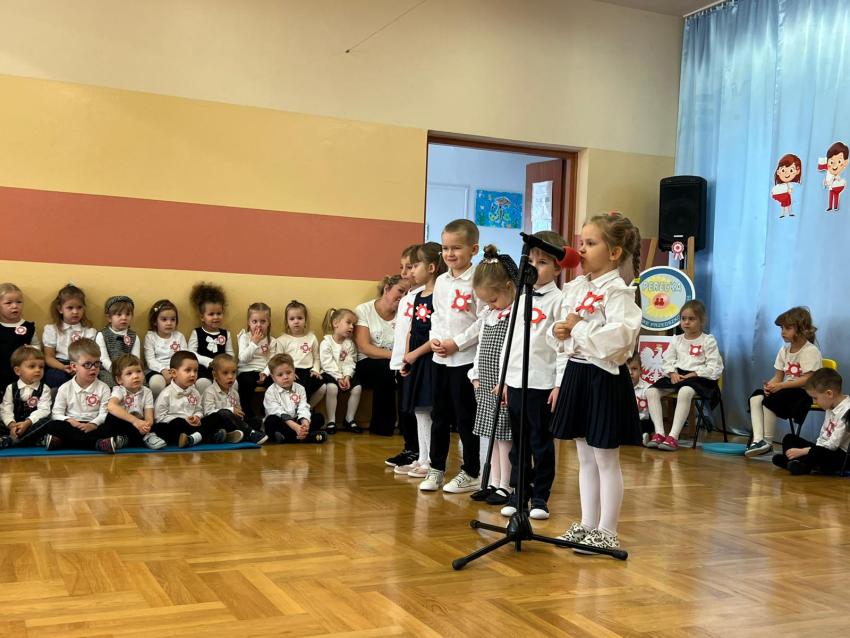 W piątek 7 listopada przedszkolaki z Perełki świętowały Dzień Niepodległości. Uroczystość prowadziła grupa dzieci 5 letnich Rozgwiazdki ale aktywnie uczestniczyły w niej wszystkie grupy. Każda miała przygotowany krótki występ związany z naszą ojczyzną - np. grupy maluszków wykonały instrumentacje ludowych melodii góralskich i krakowskich, grupy średniaków przedstawiły legendę o syrence warszawskiej i taniec bałtyckich fal a grupa najstarsza - zjawiskowo zaprezentowała poloneza. Głównym punktem spotkania było uroczyste wciągnięcie biało - czerwonej flagi na maszt, przez poczet sztandarowy złożony z żołnierzy WP (czyli tatusiów naszych przedszkolaków) i ich pociechy. Maszt został zainstalowany w ogrodzie naszego przedszkola dzięki fundacji Flaga Na Maszt, której przedstawiciel był obecny na uroczystości. Gośćmi, którzy wzięli udział w obchodach Święta Niepodległości byli też przedstawiciele Rady Miasta i Rady Dzielnicy. Pogoda dopisała, uroczystość miała piękną, jesienną oprawę.