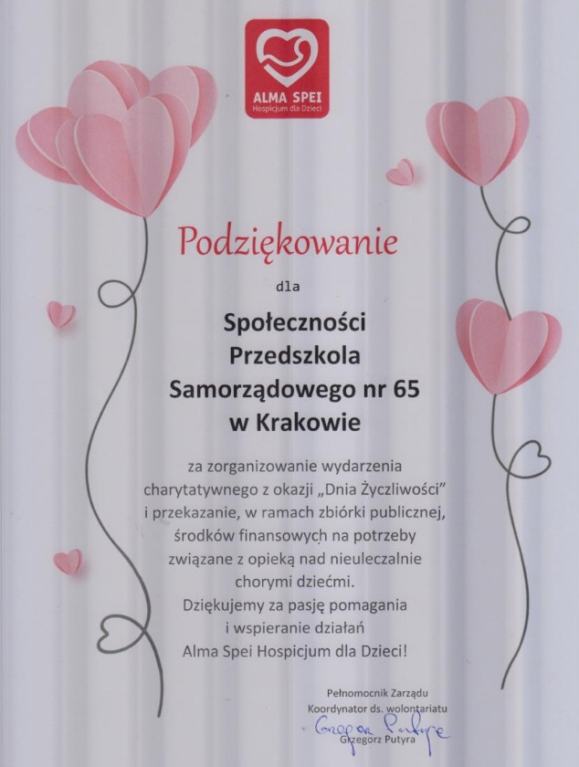 Dzięki Państwa zaangażowaniu mogliśmy wesprzeć wspólnie Hospicjum dla dzieci Alma Spei. Bardzo dziękujemy, dochód z akcji charytatywnej został przekazany fundacji. W ramach zbiórki udało się zebrać kwotę 754,23 PLN (puszka 643 - 651,22 PLN, puszka nr 661 - 103,01 PLN). DZIĘKUJEMY!