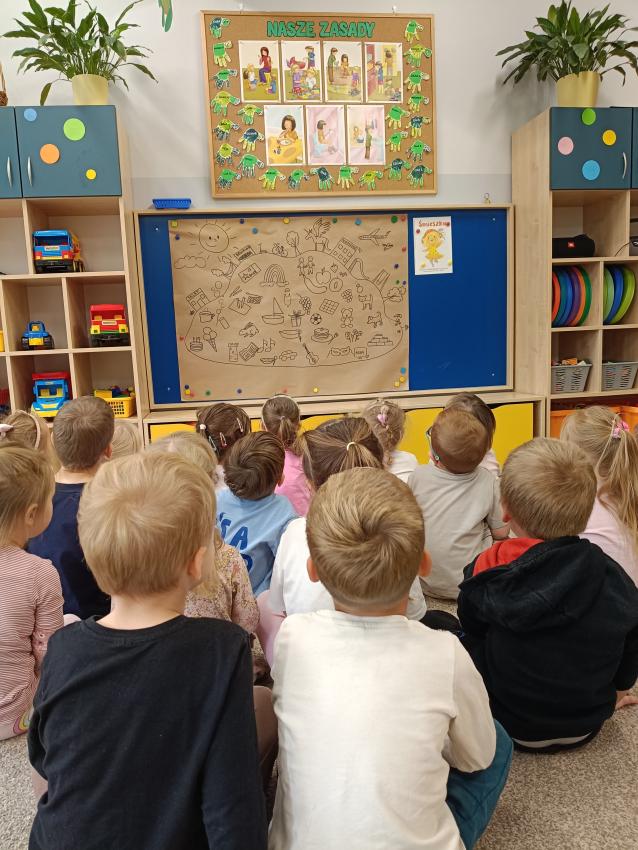 Podczas pierwszego spotkania poznaliśmy Śmieszkę, która mieszka na Wyspie radości i pojawia się zawsze wtedy kiedy jest nam wesoło. Żółwiki opowiadały o tym jak okazują radość, jakie sytuacje wyzwalają w nich uczucie radości, stworzyły Wyspę Radości, na której znalazły się wszystkie radosne rzeczy. Obejrzeliśmy także film o Śmieszce i zaczęliśmy się uczyć projektowej piosenki. Na zakończenie działań dzieci uzupełniły zadania w projektowym zeszycie - wkleiły do tabelki obrazek ze Śmieszką, pokolorowały kolorowankę i narysowały to, co sprawia im radość.