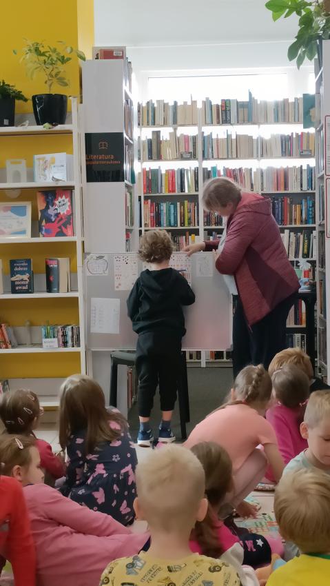 Grupa Płaszczek wybrała się na wizytę do pobliskiej biblioteki. Tam porozmawiali o porach roku, wyróżnili ich poszczególne cechy, a następnie skupili się na temacie jesieni. Posłuchali też krótkiego opowiadania o złodzieju liści. W ostatniej części zajęć bibliotecznych, każde dziecko otrzymało zadanie do rozwiązania.