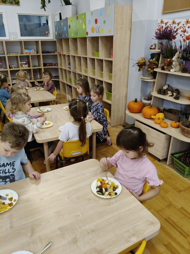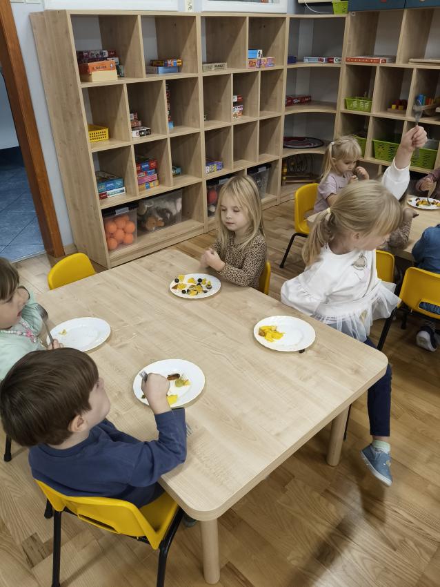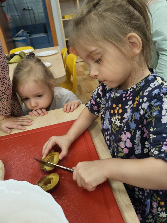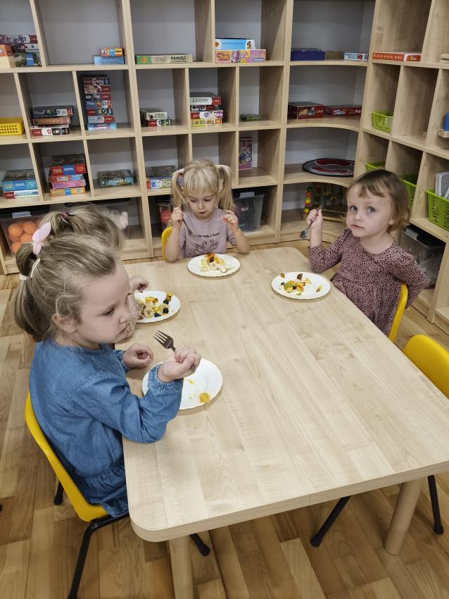 Dzieci z zaangażowaniem kroiły, mieszały i komponowały swoje porcje witamin, ucząc się przy tym, jak ważne jest codzienne spożywanie świeżych owoców i warzyw. Rozmawialiśmy także o tym, dlaczego zdrowe odżywianie jest tak ważne ? że daje nam energię do zabawy, nauki i pomaga rosnąć silnym i zdrowym. Serdecznie dziękujemy Rodzicom za współpracę i przyniesienie pysznych owoców! Dzięki Wam dzieci mogły wspólnie przeżyć smakowitą i pełną radości przygodę kulinarną.